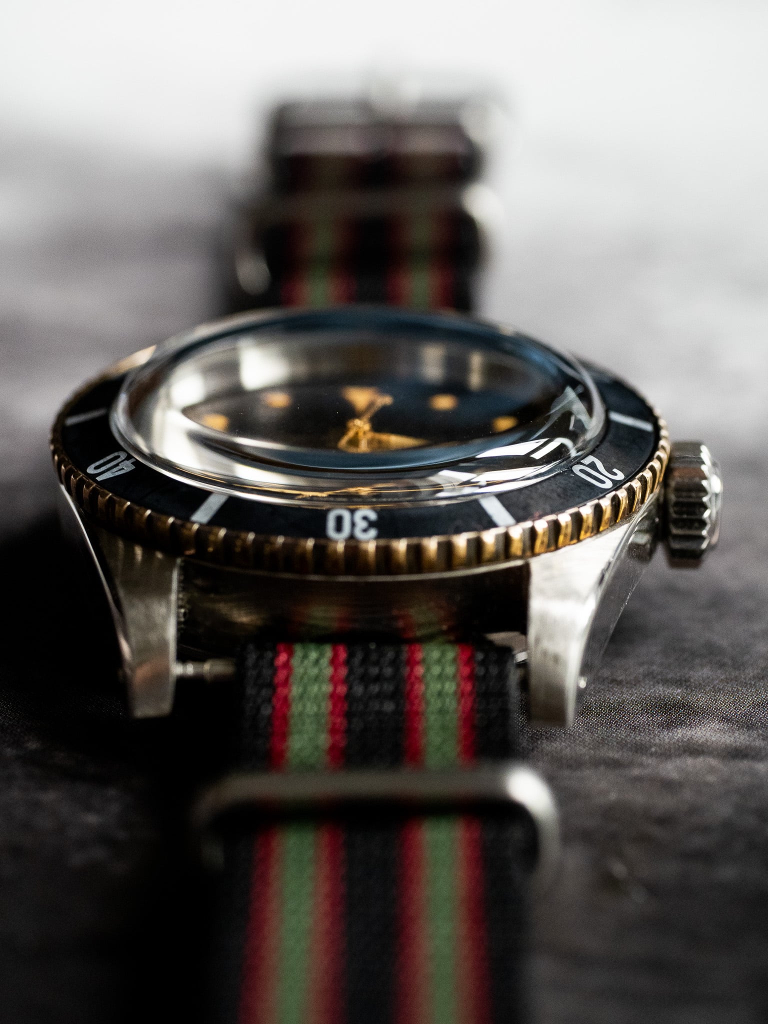 クラシックな外観を彷彿とさせる16mm幅のNATOスタイルの 「BOND STRAP 」を組み合わせ、