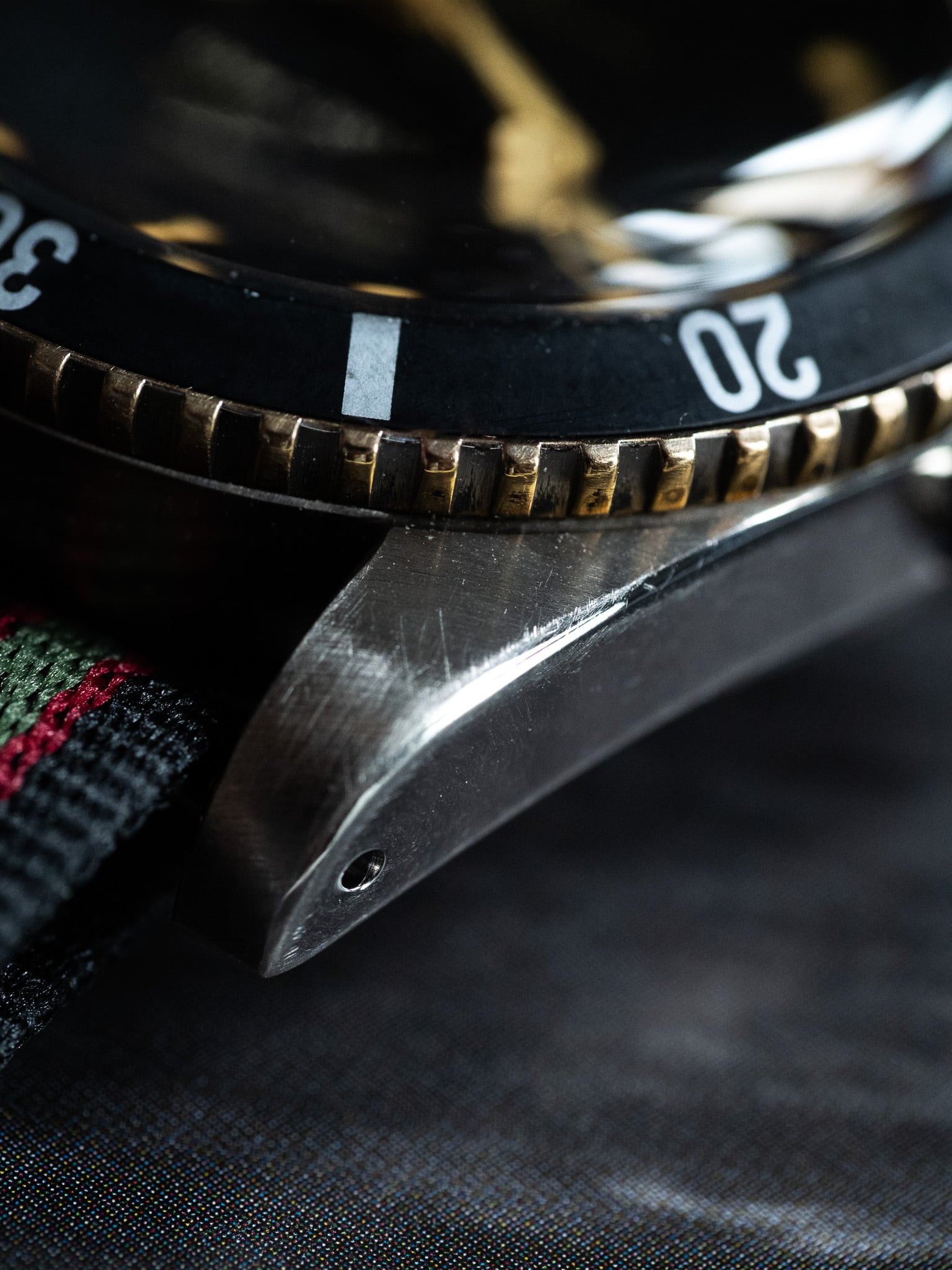 真鍮製のベゼルと、当時のヴィンテージスピリットを表現したエイジド仕上げが特徴です。