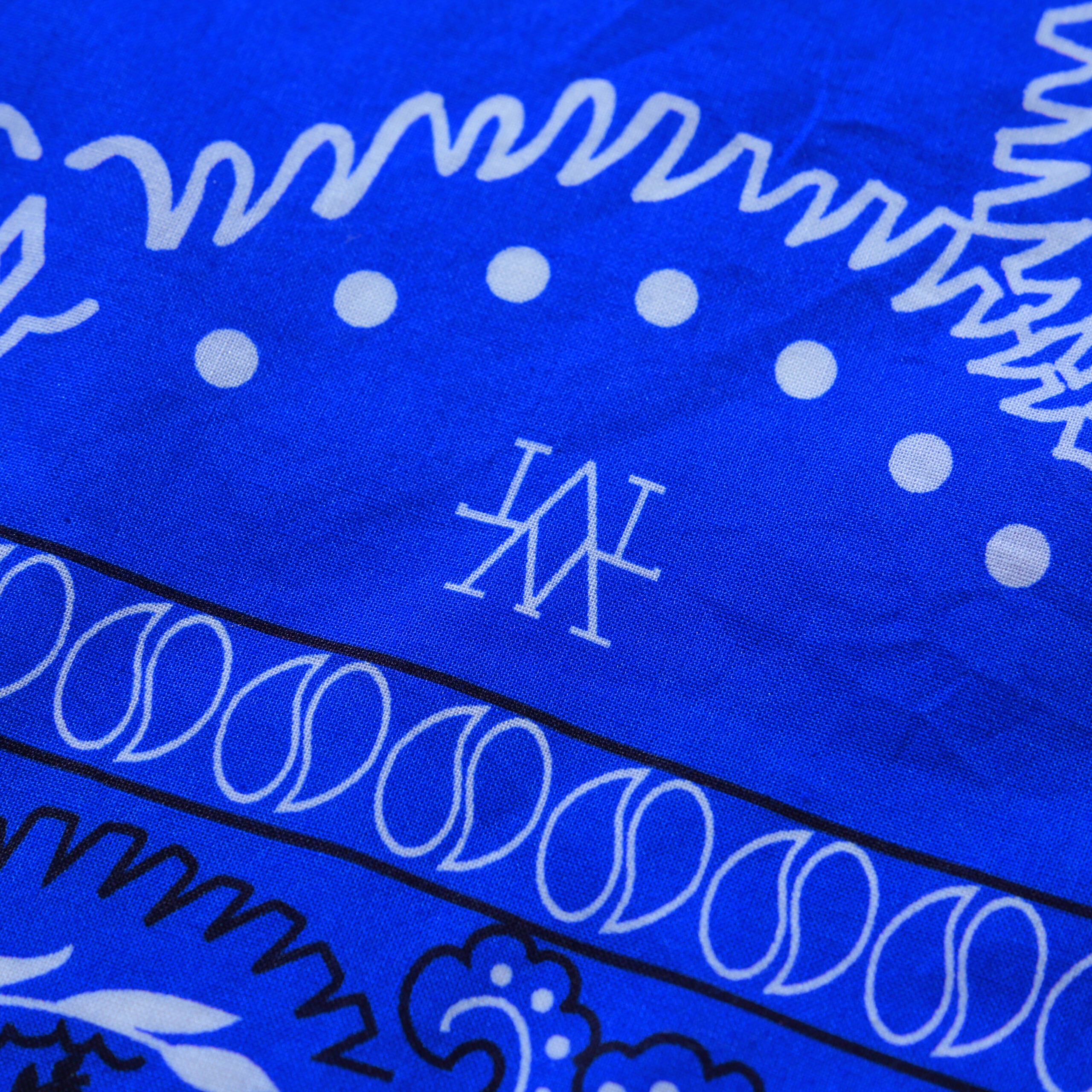 鮮やかなロイヤルブルーに染め上げられた生地には、クラシックなペイズリー柄と