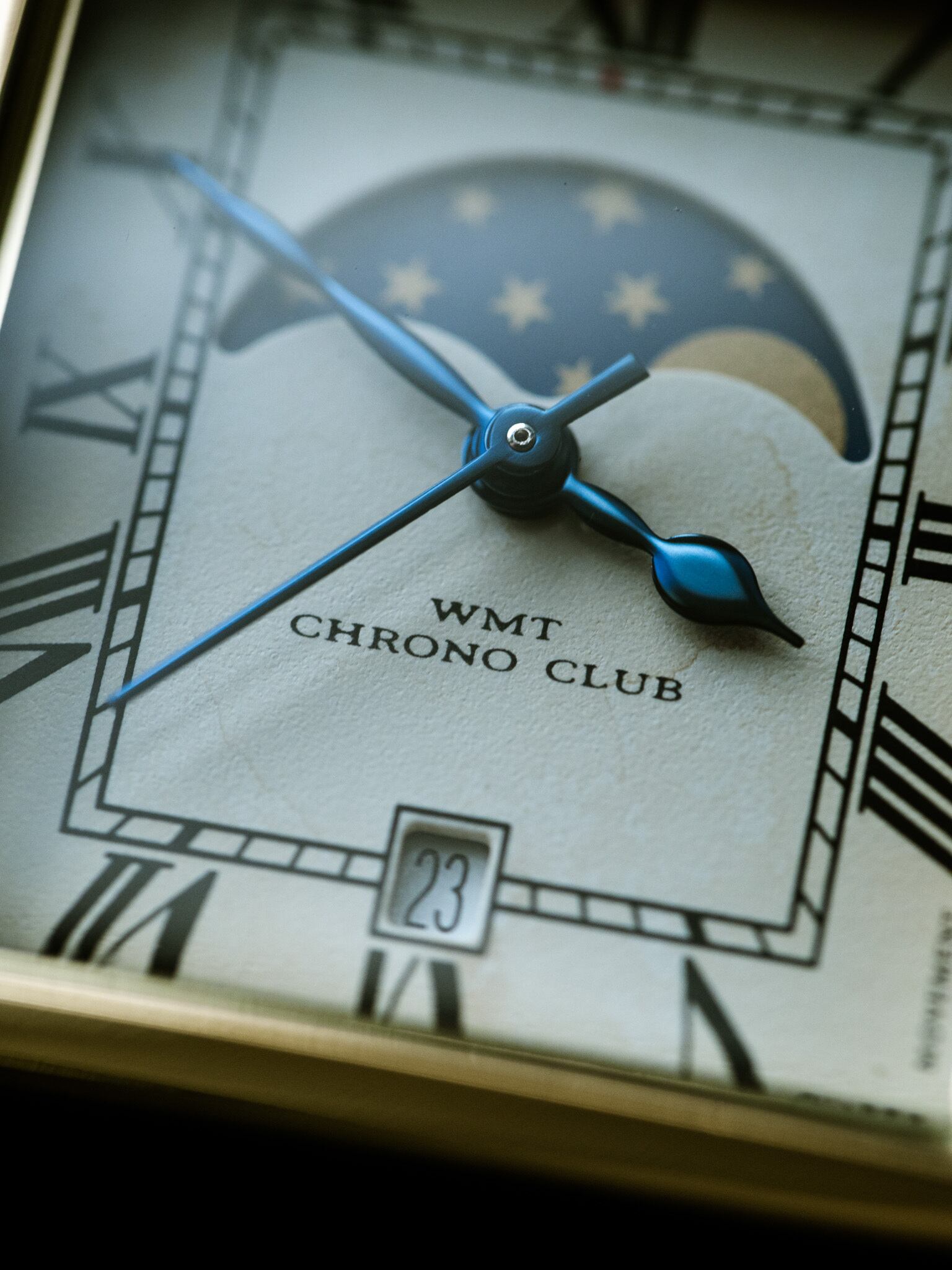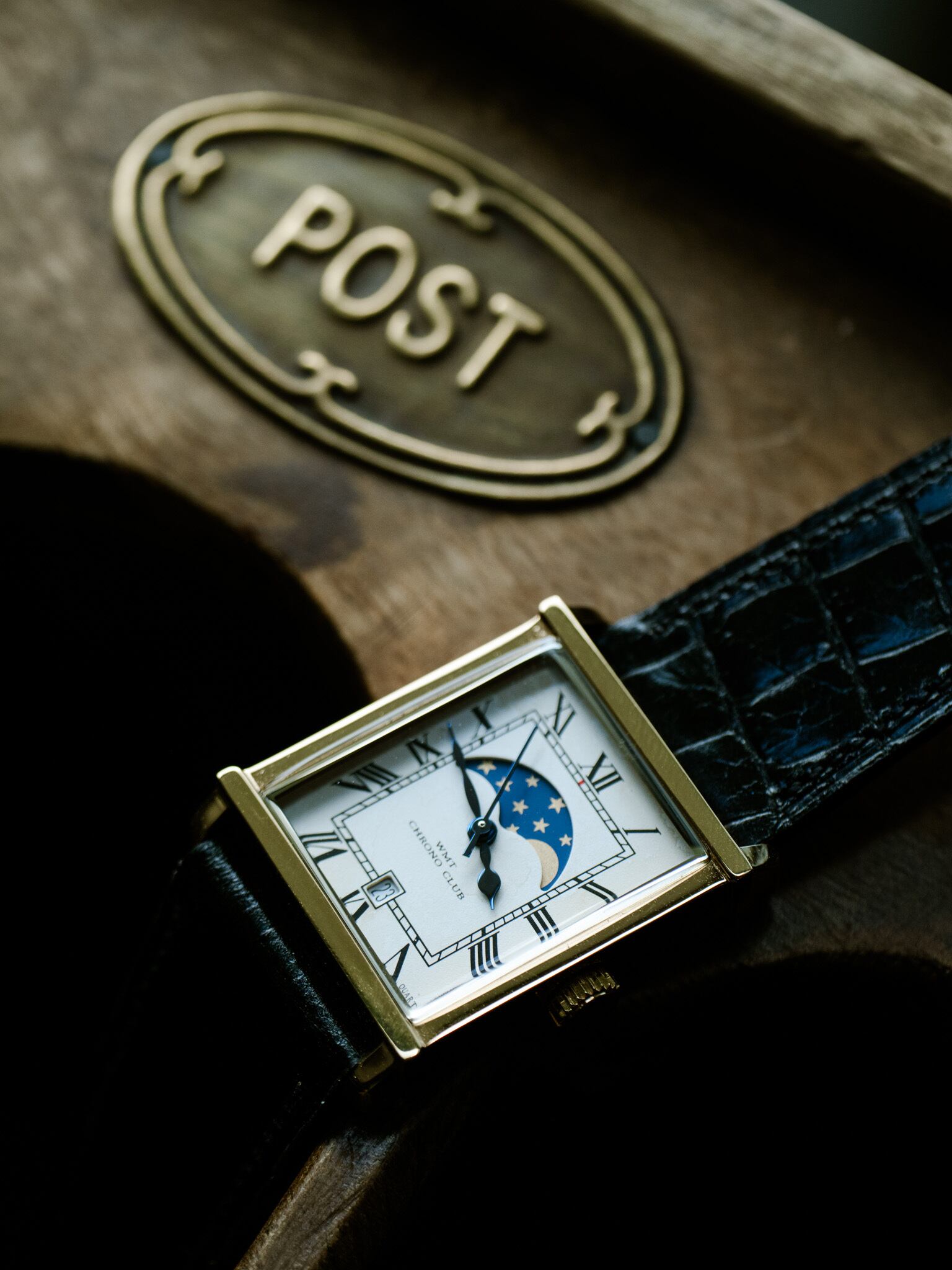 クラシックなレクタンギュラーケースにヴィンテージ風のレイアウトを採用したCURVEX G01は、ムーンフェイズ機構を搭載。