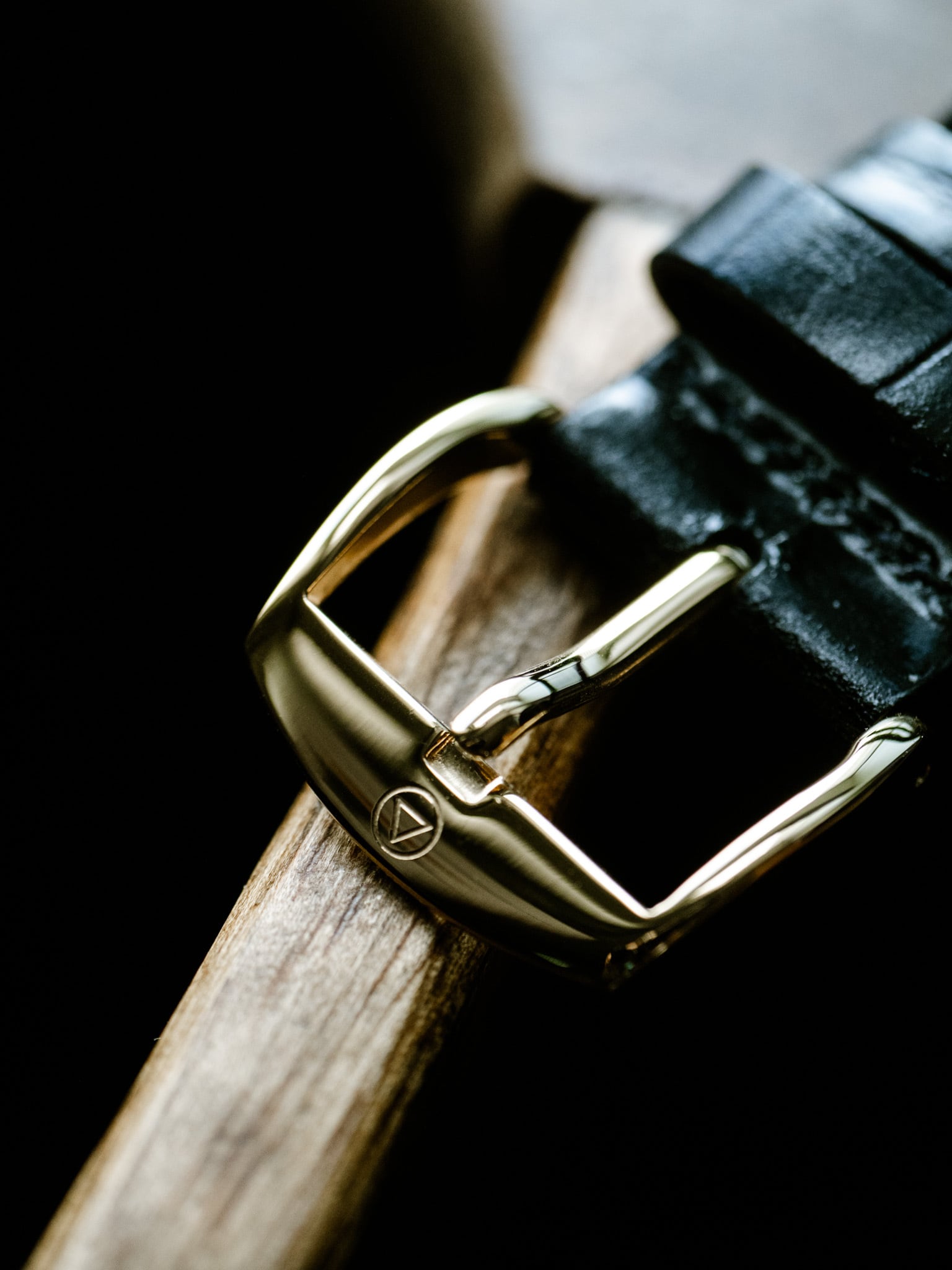 Rondaクォーツムーブメントを搭載し、工具不要で交換可能なクイックリリース式レザーストラップが付属。