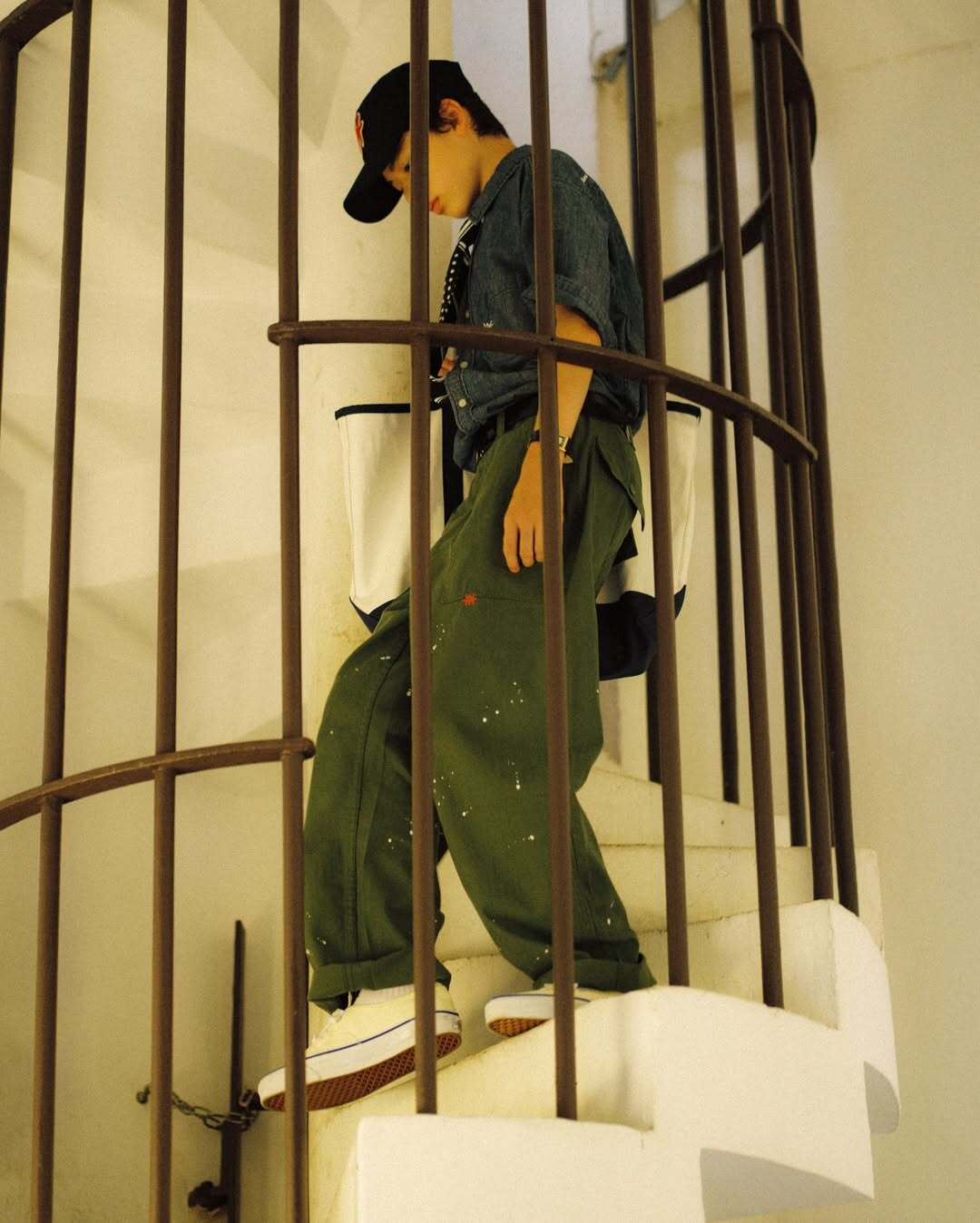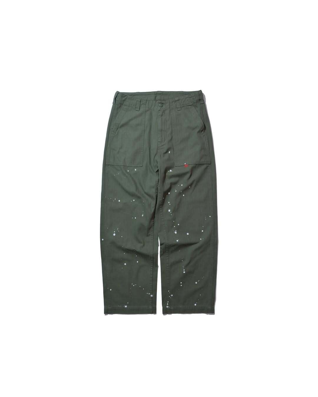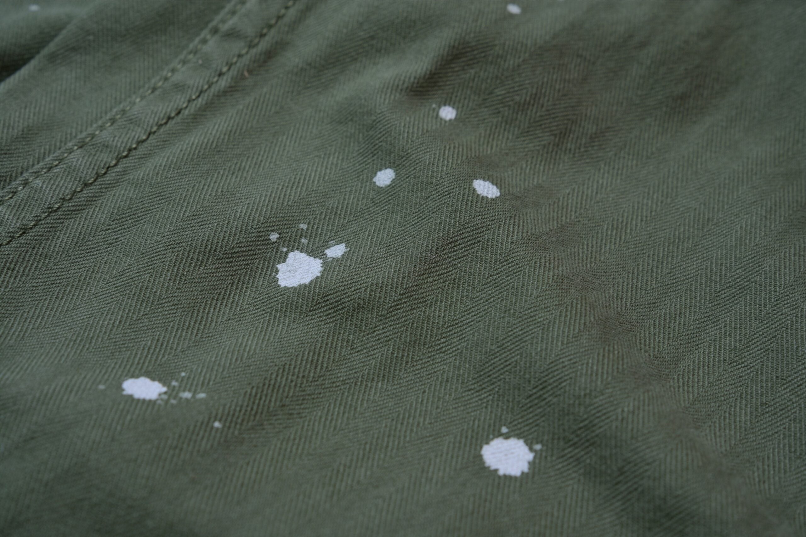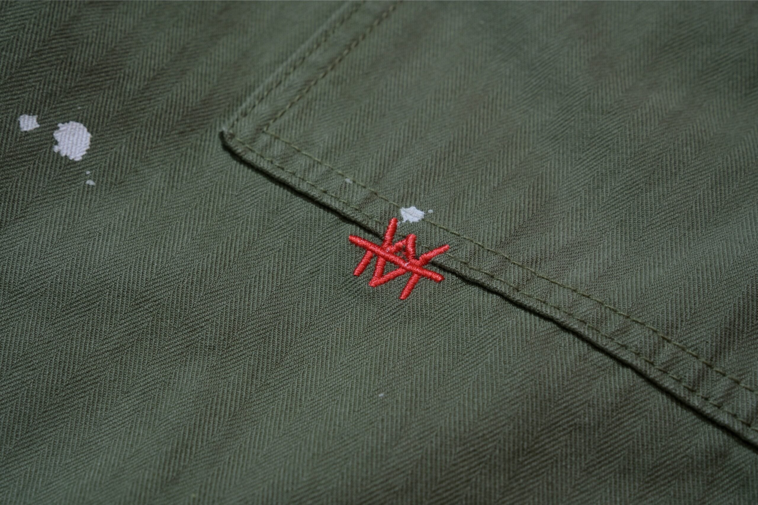 WCNCは、本物のコットンヘリンボーンツイルを使用し、オリジナルに忠実に調節バックルやフロントポケットなどのディテールを再現。カラーはオリーブとクリームの2色展開で、パンツ全体に手作業によるペイントスプラッシュ加工を施し、フロントポケットには控えめな刺繍を配置。軍用の実用性と日本のクラフト美学を見事に融合させた一本です。
