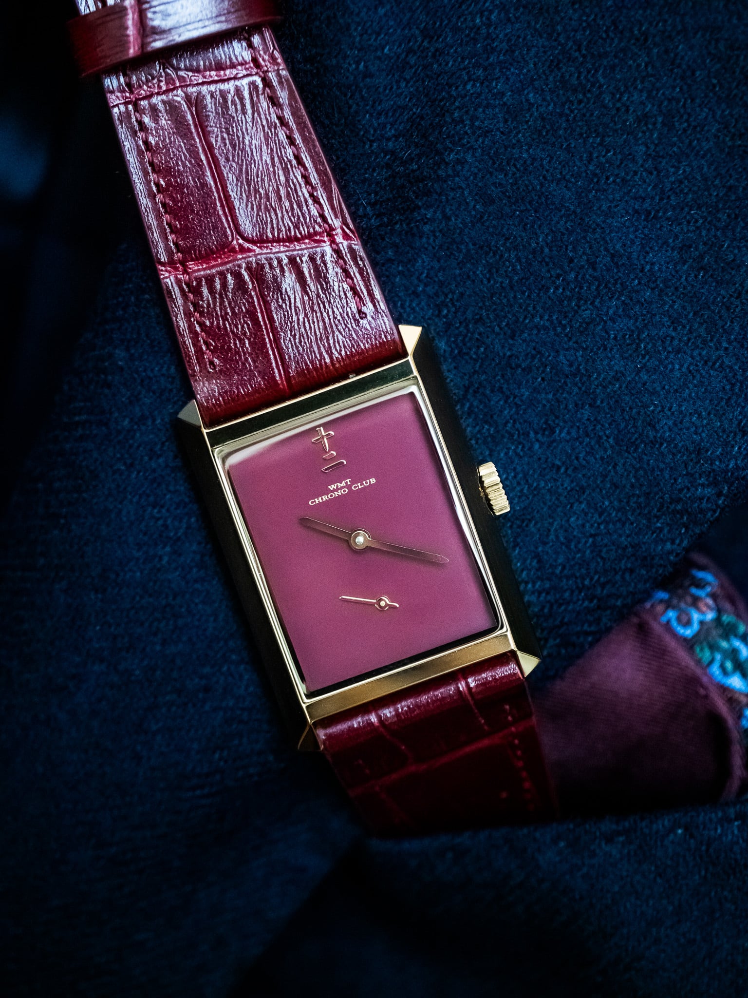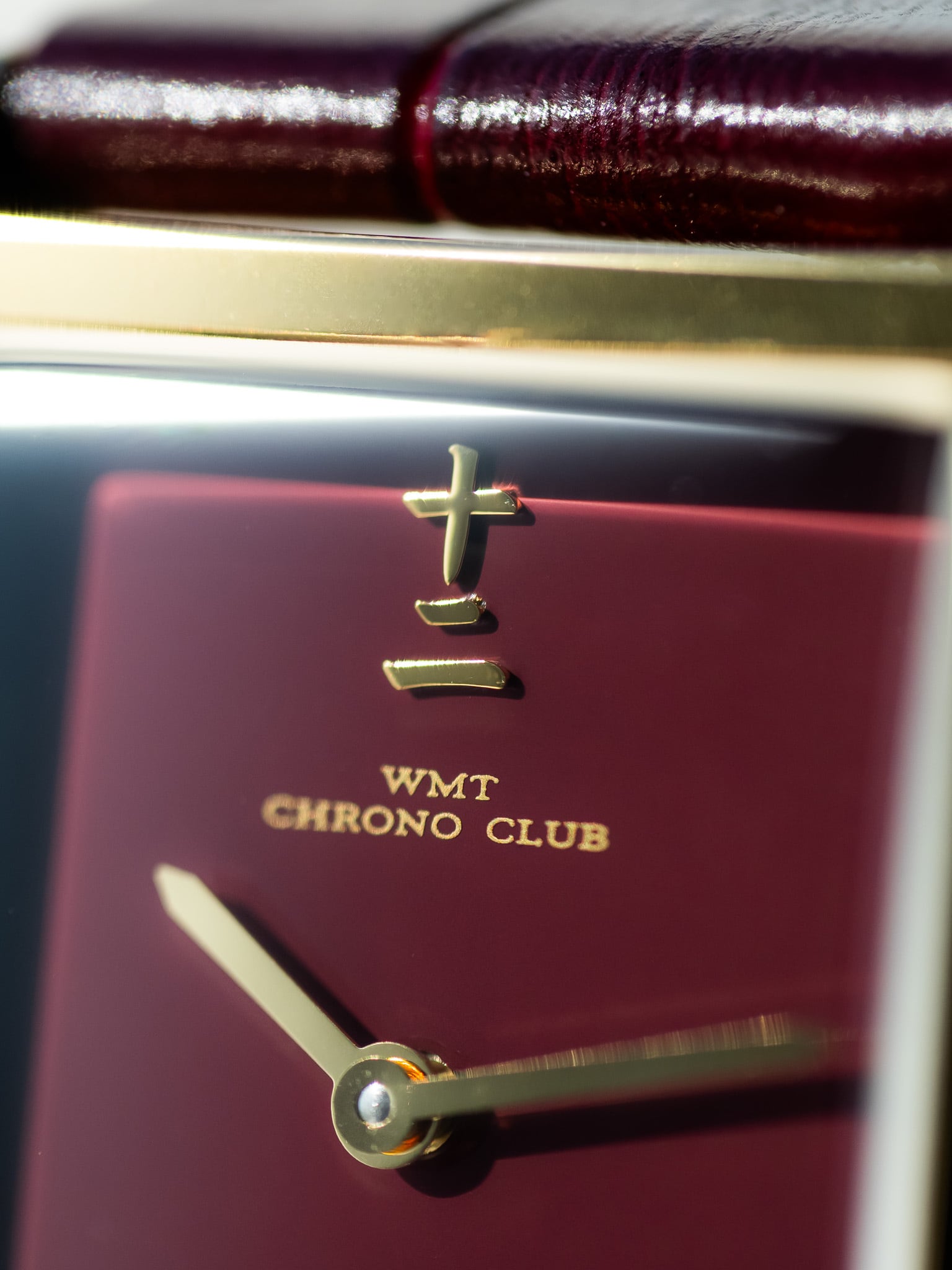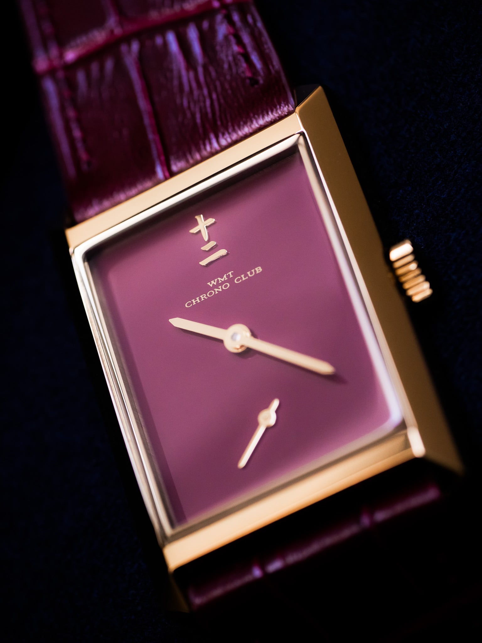 バーガンディラッカー仕上げのダイアルは装飾を極限まで削ぎ落とし、