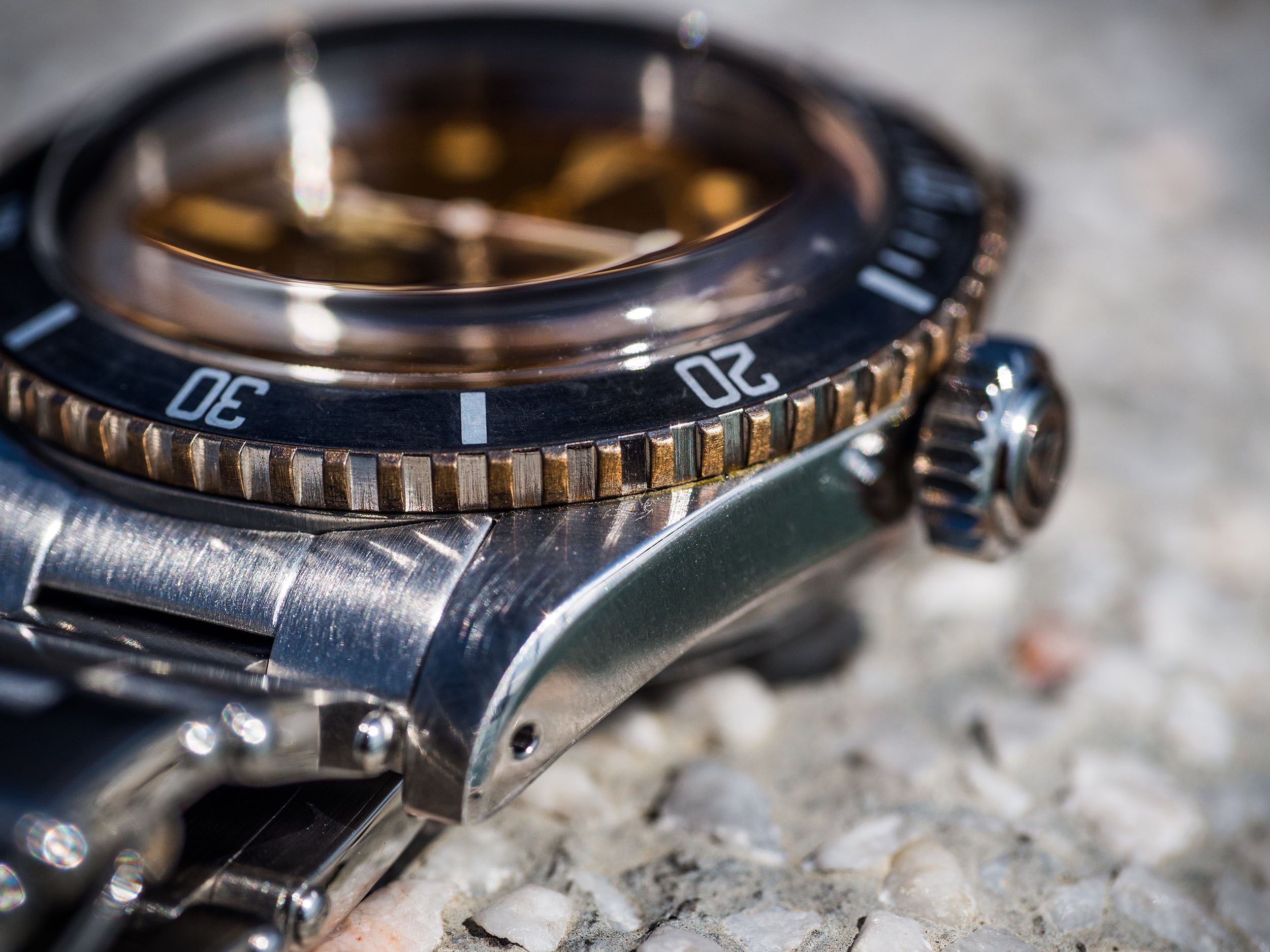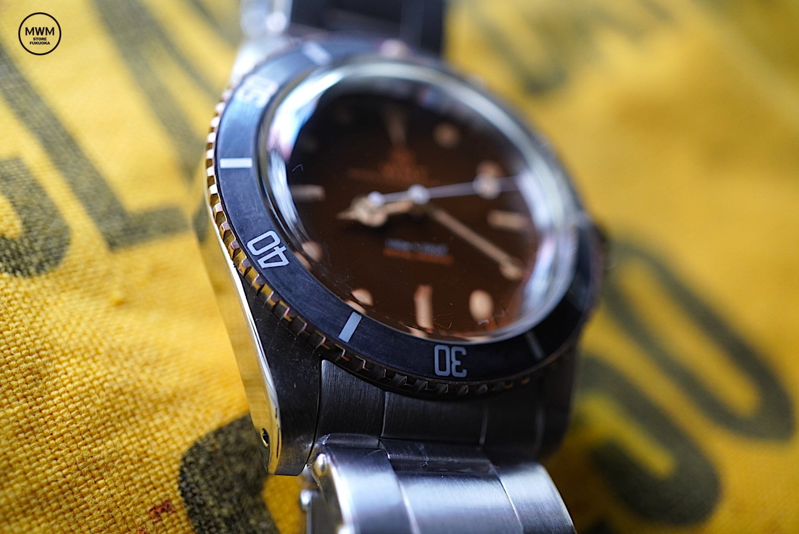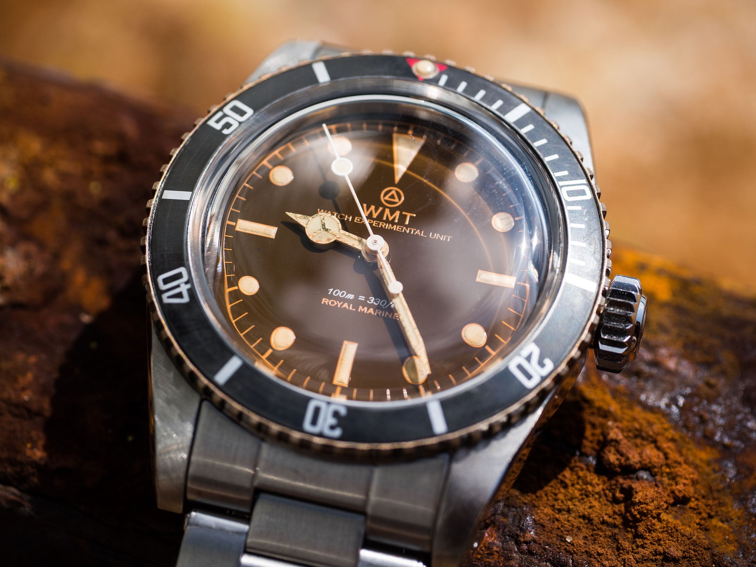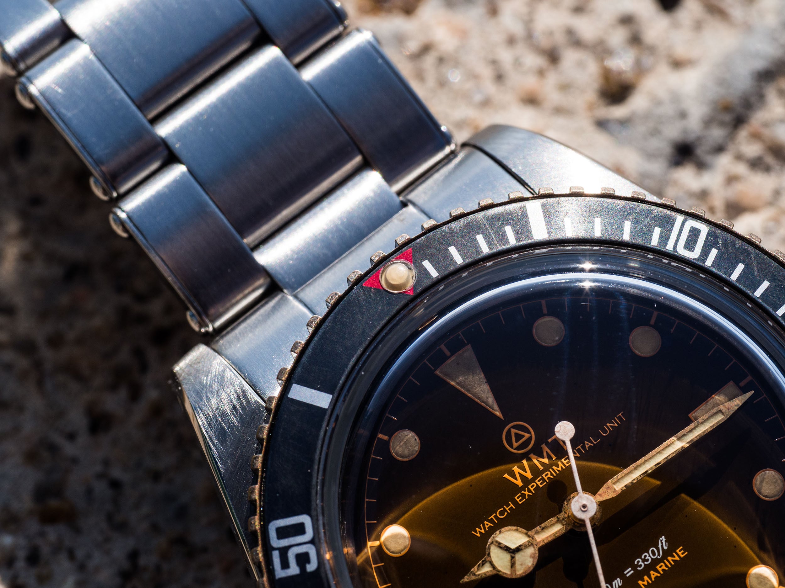 ヴィンテージ加工が施されたダイアルは、トロピカルな雰囲気を醸し出すウォームブラウンとなり、新たな“レッドトライアングル”インサートがセットされました。