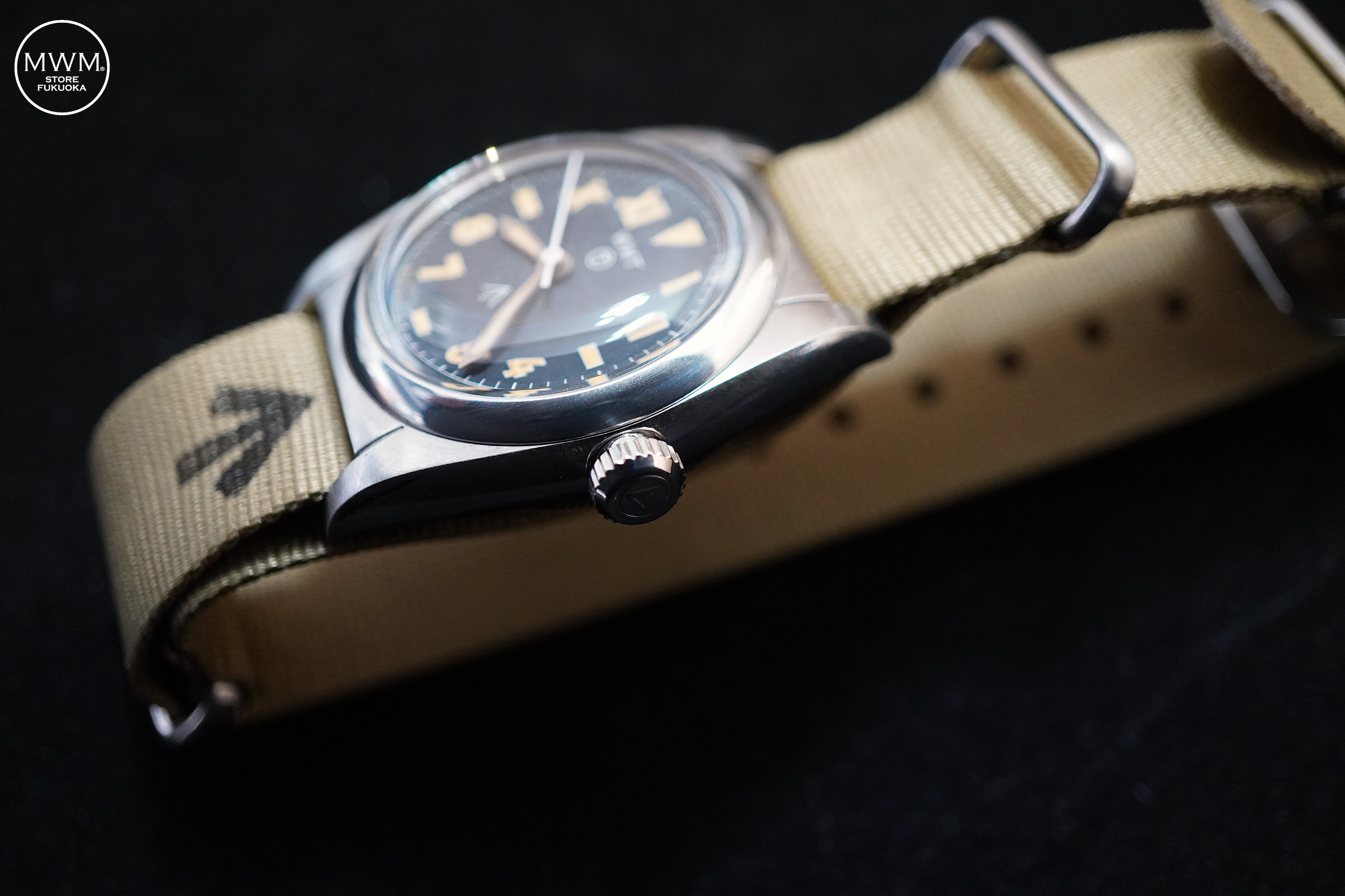 1940年代らしいリューズの形状に、ブロードアローのカーキNATOストラップ