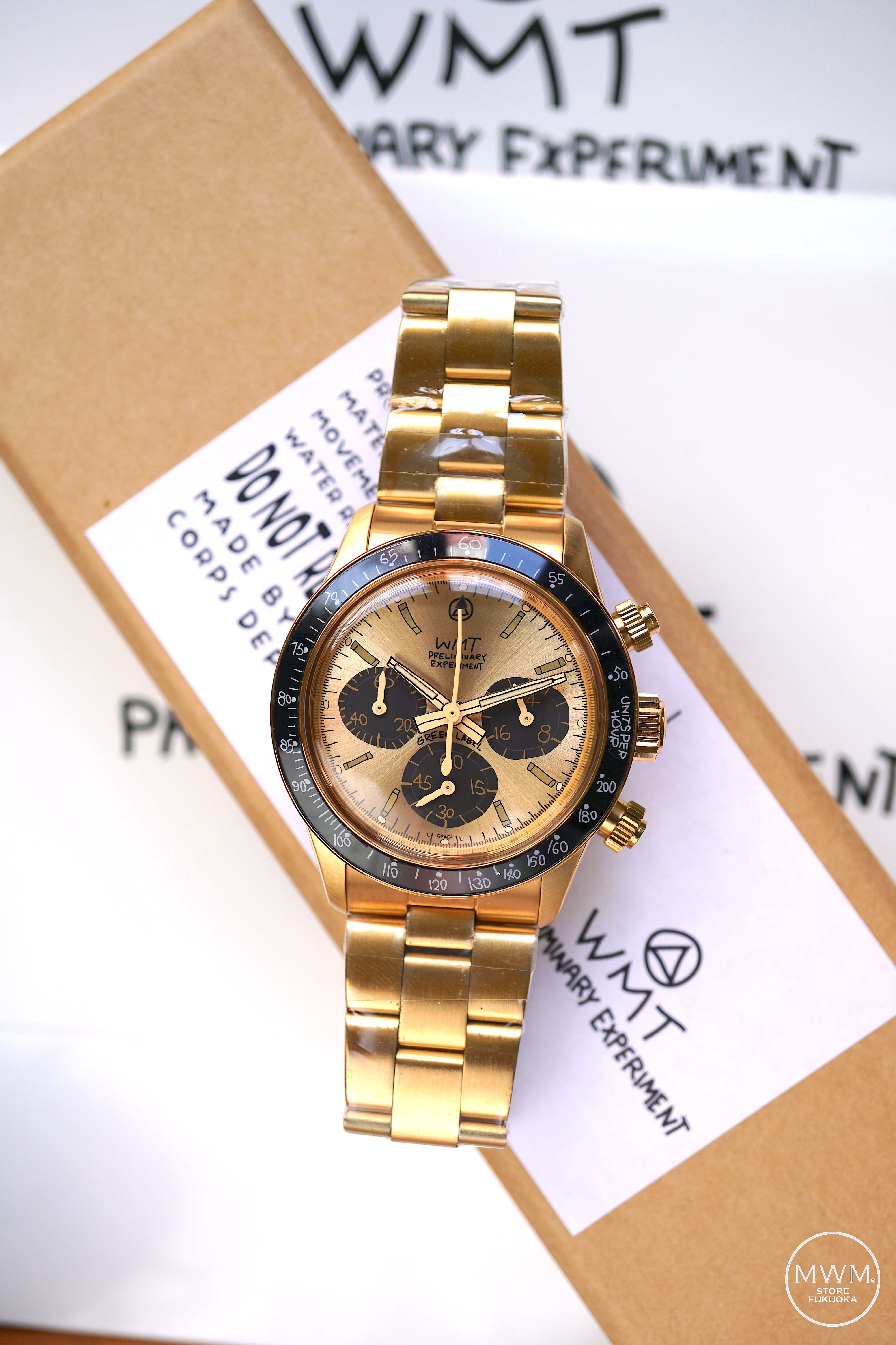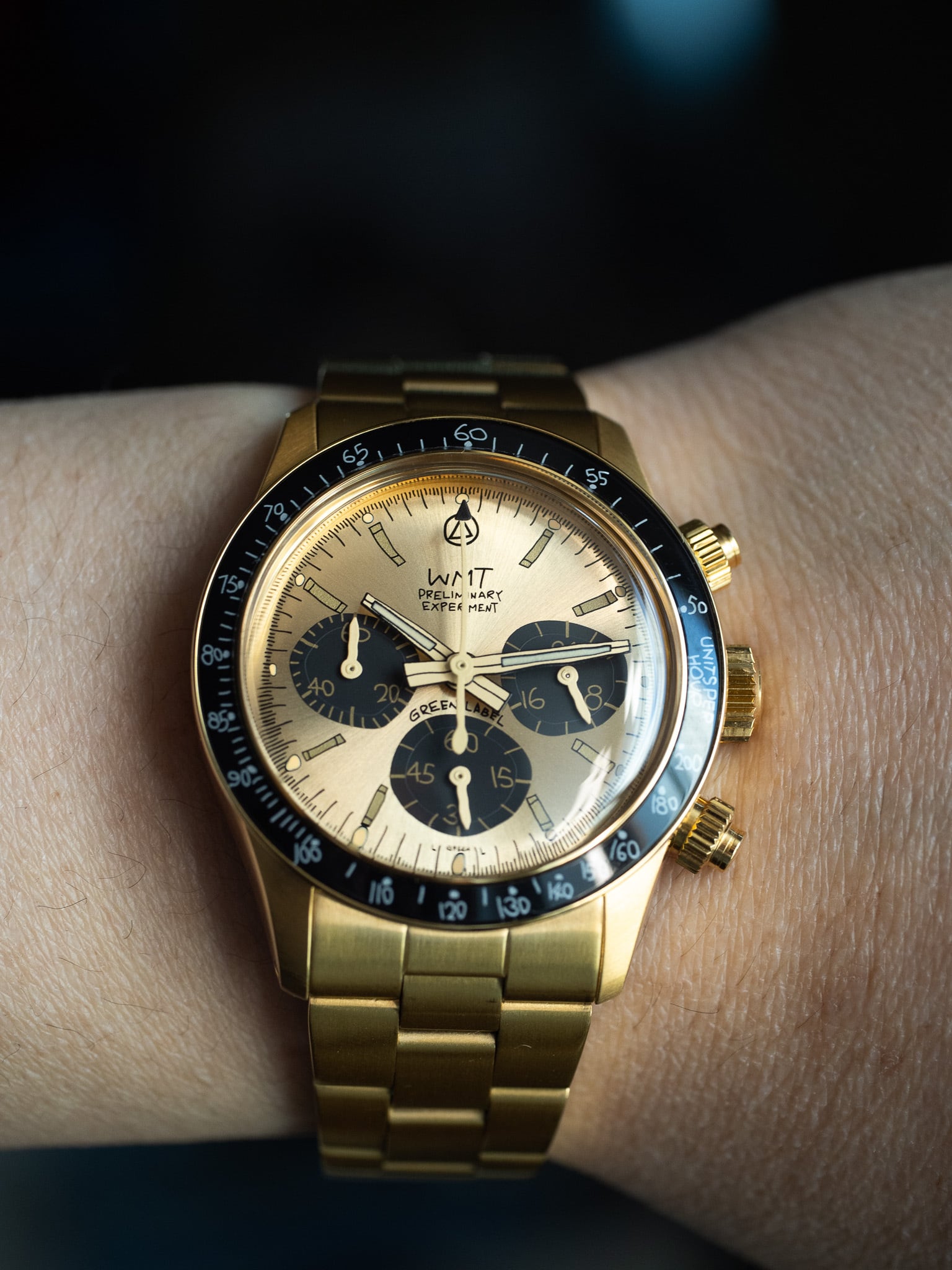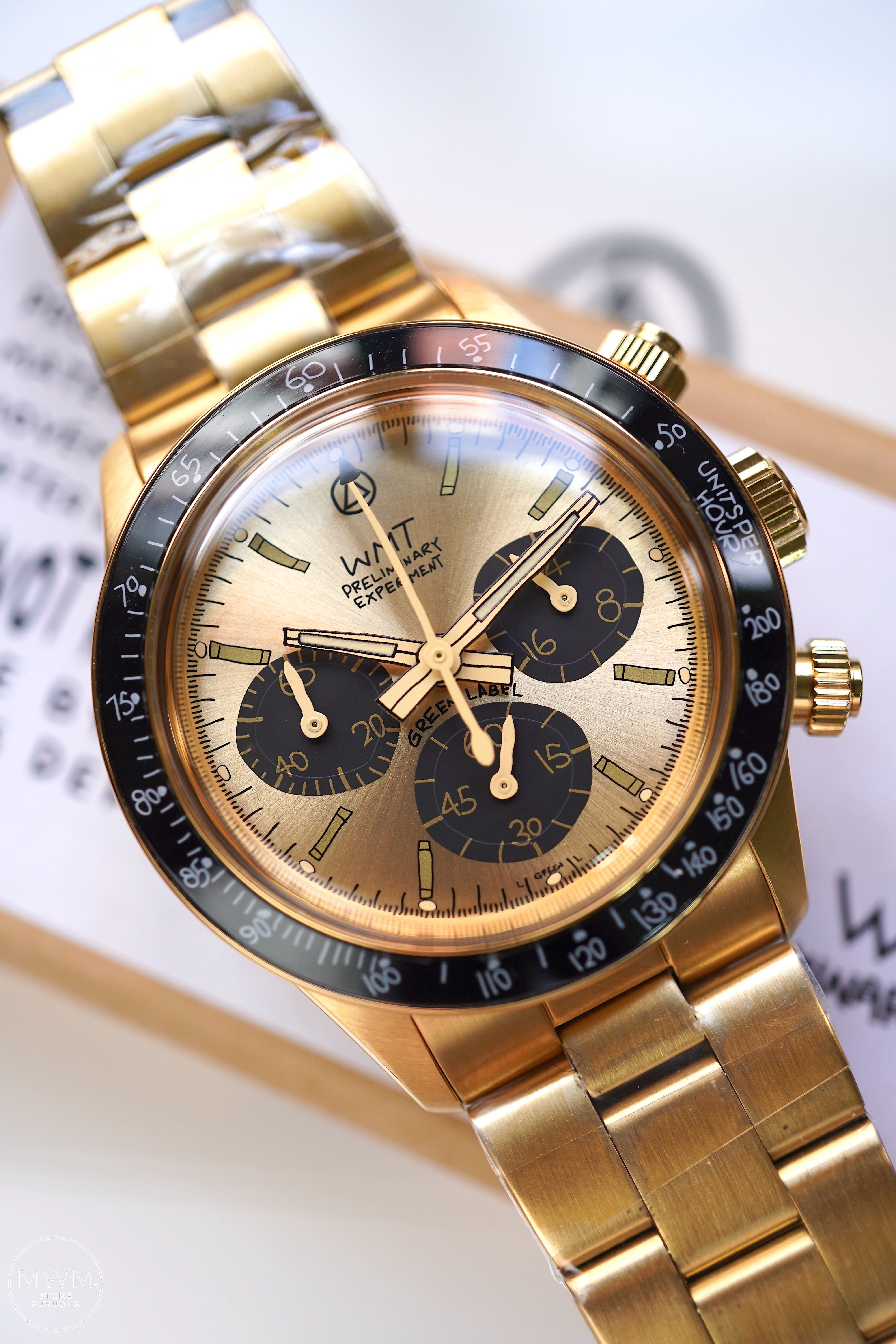 ゴールドとブラックのコンビネーションが印象的で、まるでコレクターズ・アイテムのようです。新しいバージョンは、ゴールドダイアルにブラックのインダイヤルのコンボ。