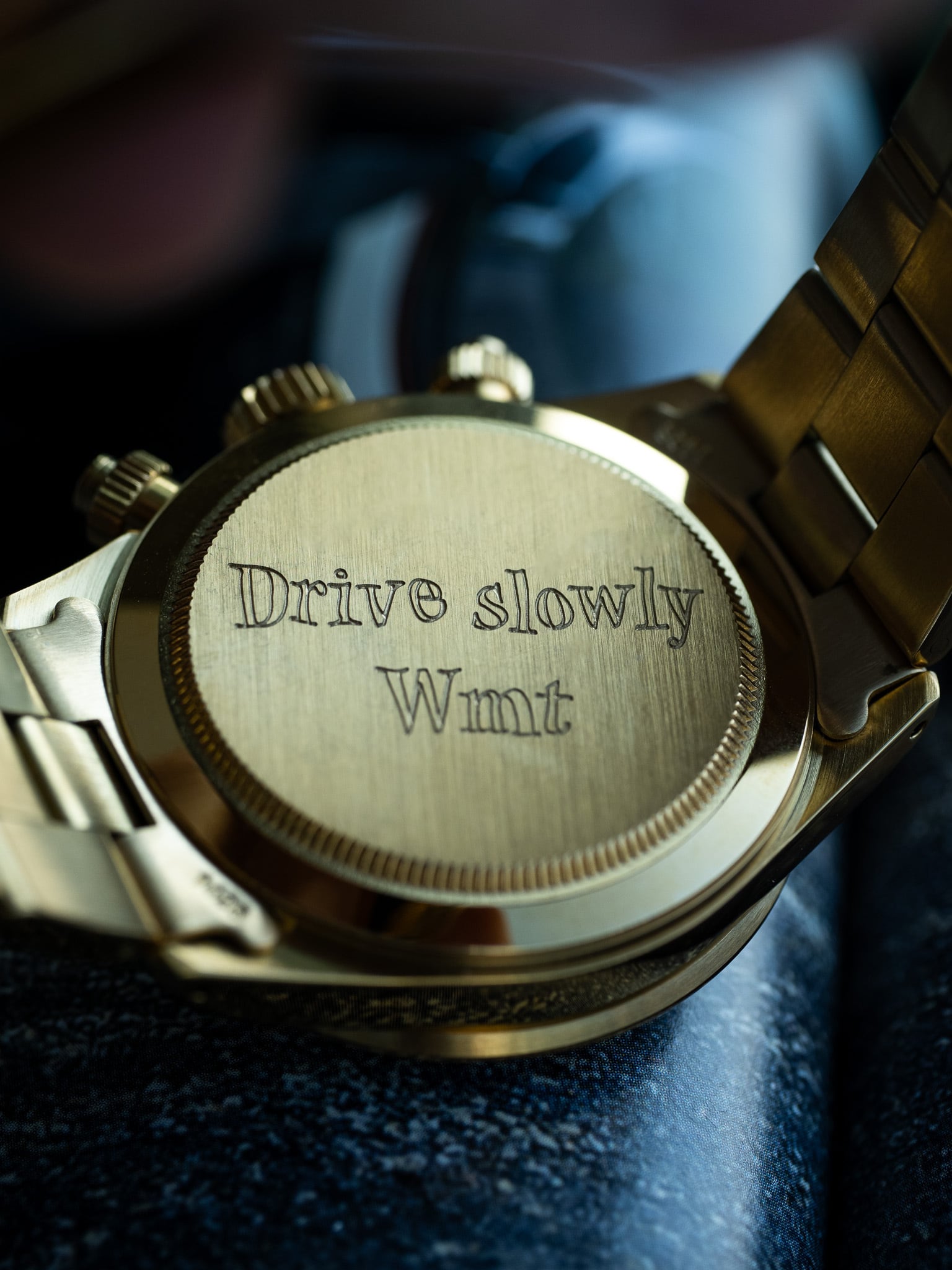 さらに、裏蓋には遊び心あふれる「Drive Slowly」の言葉が刻まれています。